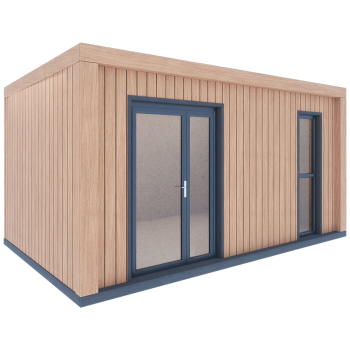 The Metro is a stunning garden room with a versatile internal space. This Garden Room features detailing with the cladding around the doors and fascia and has French doors to one side of the front elevation and a full height glazed panel to the other.